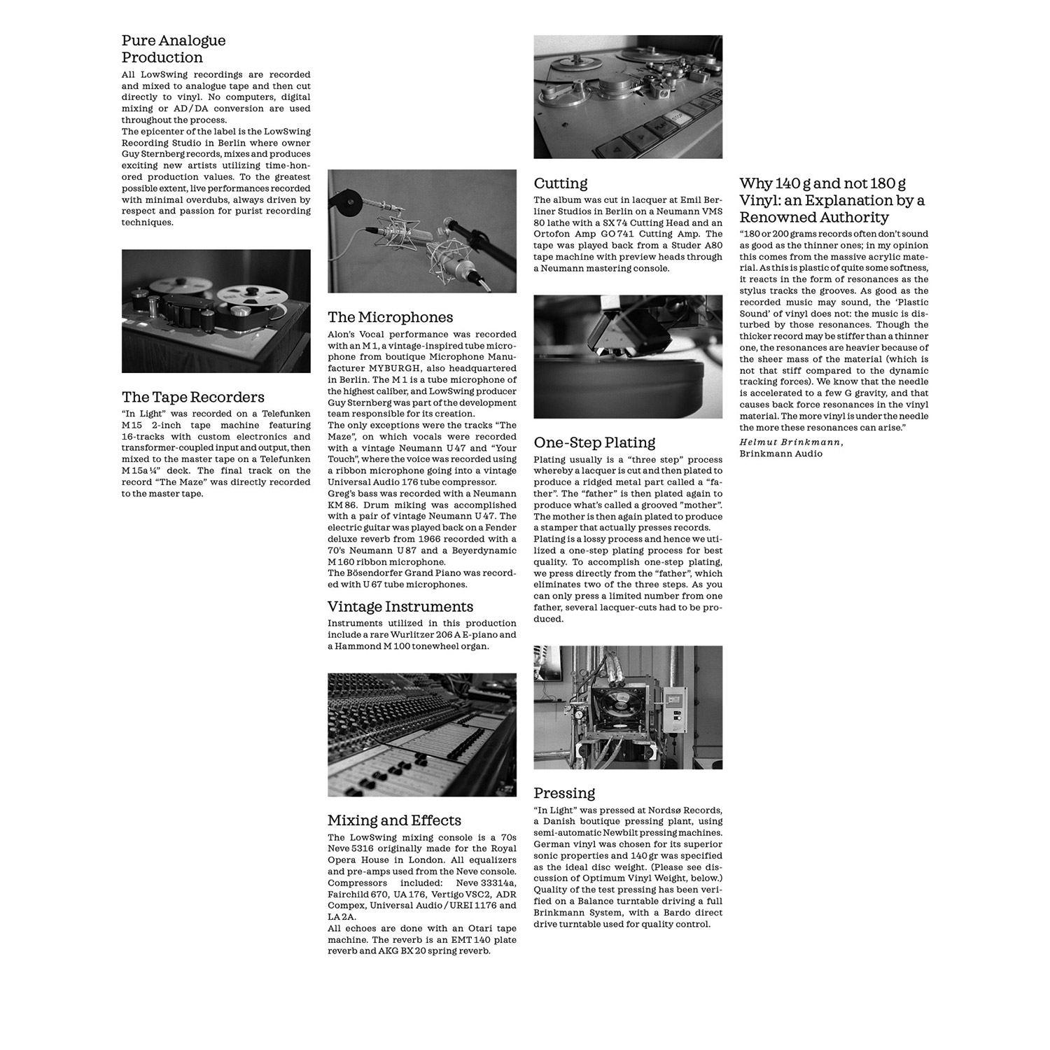 모든 음악은 텔레풍켄 2인치 16트랙 릴데크로 아날로그 테이프에 녹음되며 전설의 Neve console mixer로 믹스한 후 Neumann/Decca 커팅 시스템으로 바이닐로 바로 찍어냅니다.
